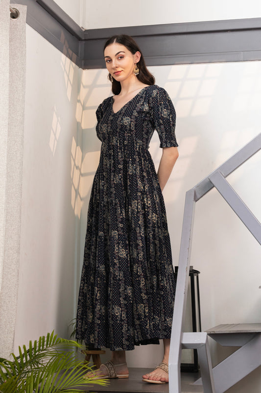 Indigo Blossom Cotton Flared Maxi Dress