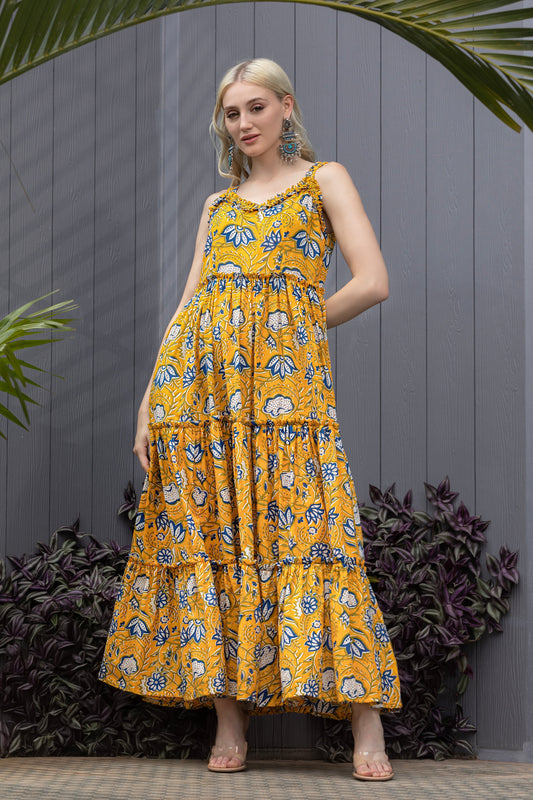 Mustard Bloom Ruffled Fit & Flare Maxi Dress