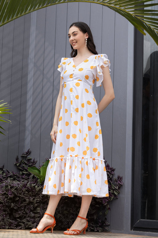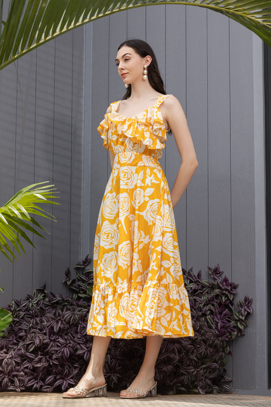 Glacier Bloom Ruffled Detail Fit & Flare Midi Dress