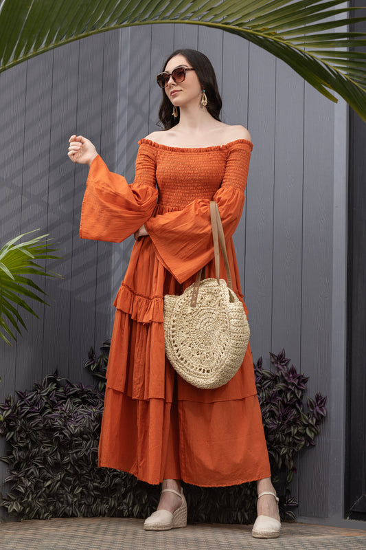 Clay Crush Smocked Neck Fit & Flare Maxi Dress