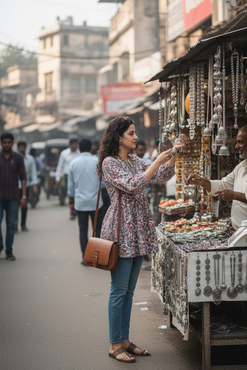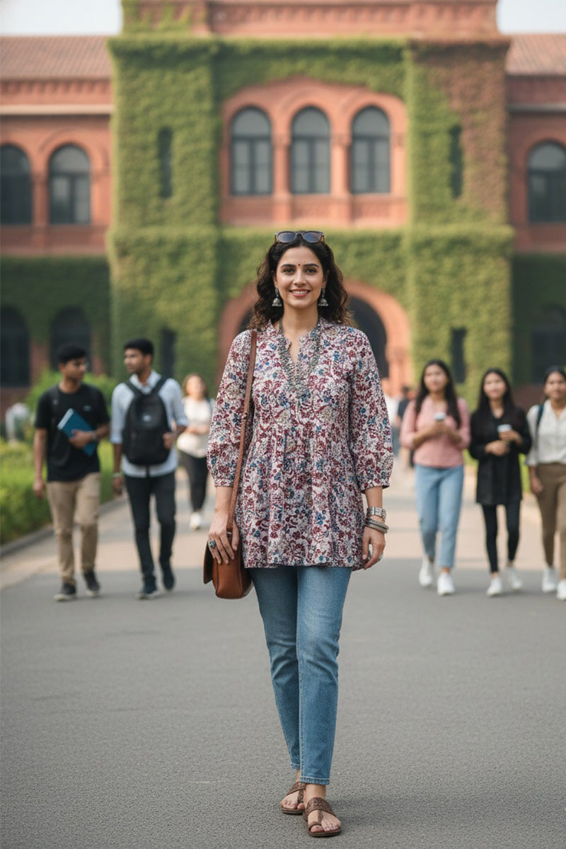 Effortlessly elegant and beautifully detailed — the Gulbagh Cotton Peplum Top is a timeless blend of comfort and charm. Crafted from premium sustainable cotton, this hand-block inspired floral top features intricate motifs in rich maroon, teal, mustard, and earthy tones. The flattering peplum silhouette cinches just below the bust for a relaxed yet structured fit, while the soft gathers flow gracefully over the body.
