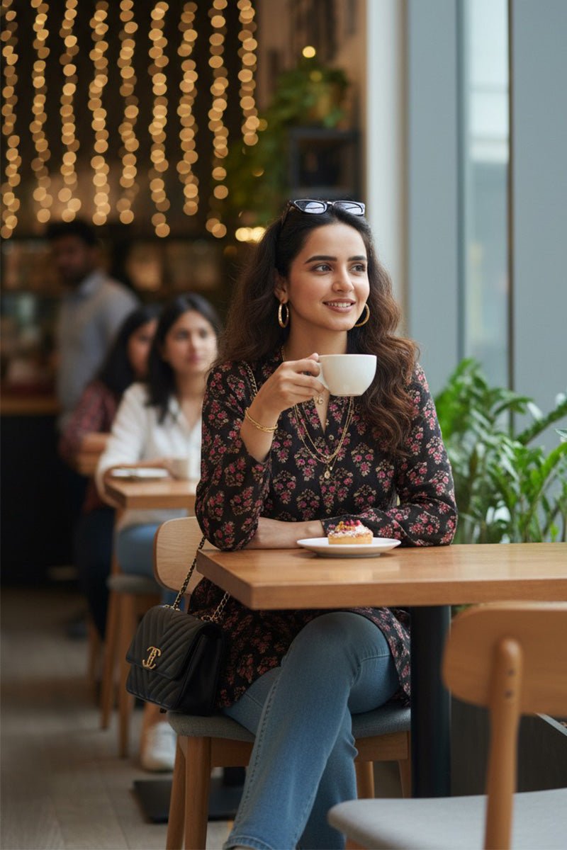 Designed with a flattering empire-line flare and subtle gathers, it drapes beautifully to complement all body types. The V-neckline and contrast-printed cuffs add definition, while the lightweight fabric makes it perfect for daily wear, college days, or casual outings.