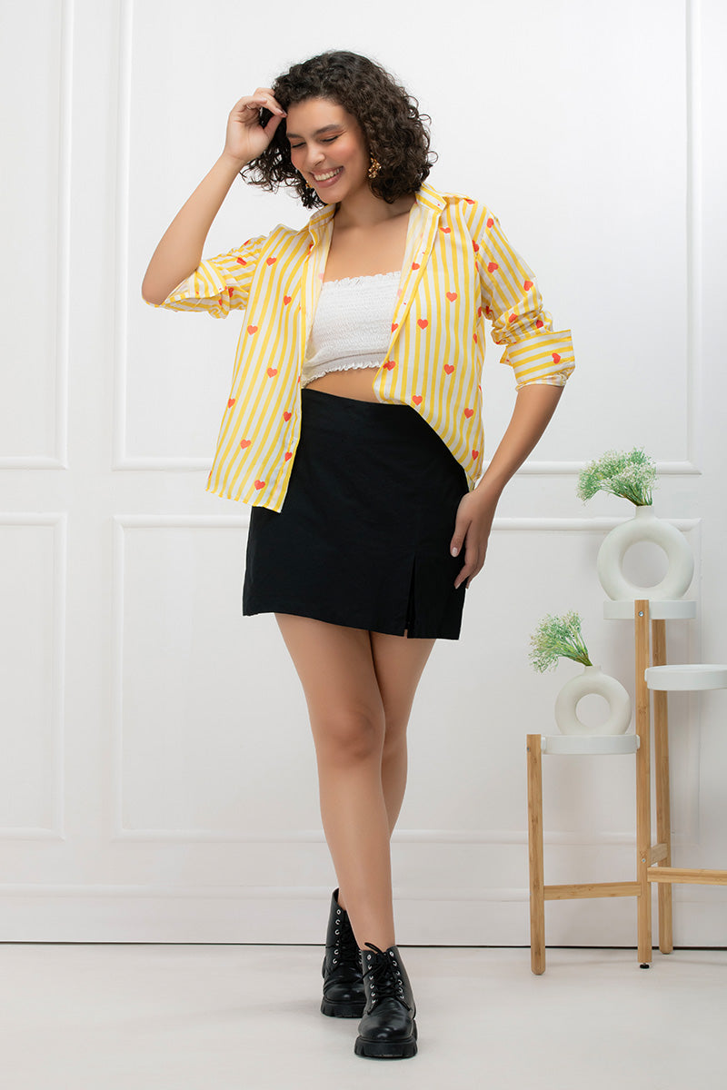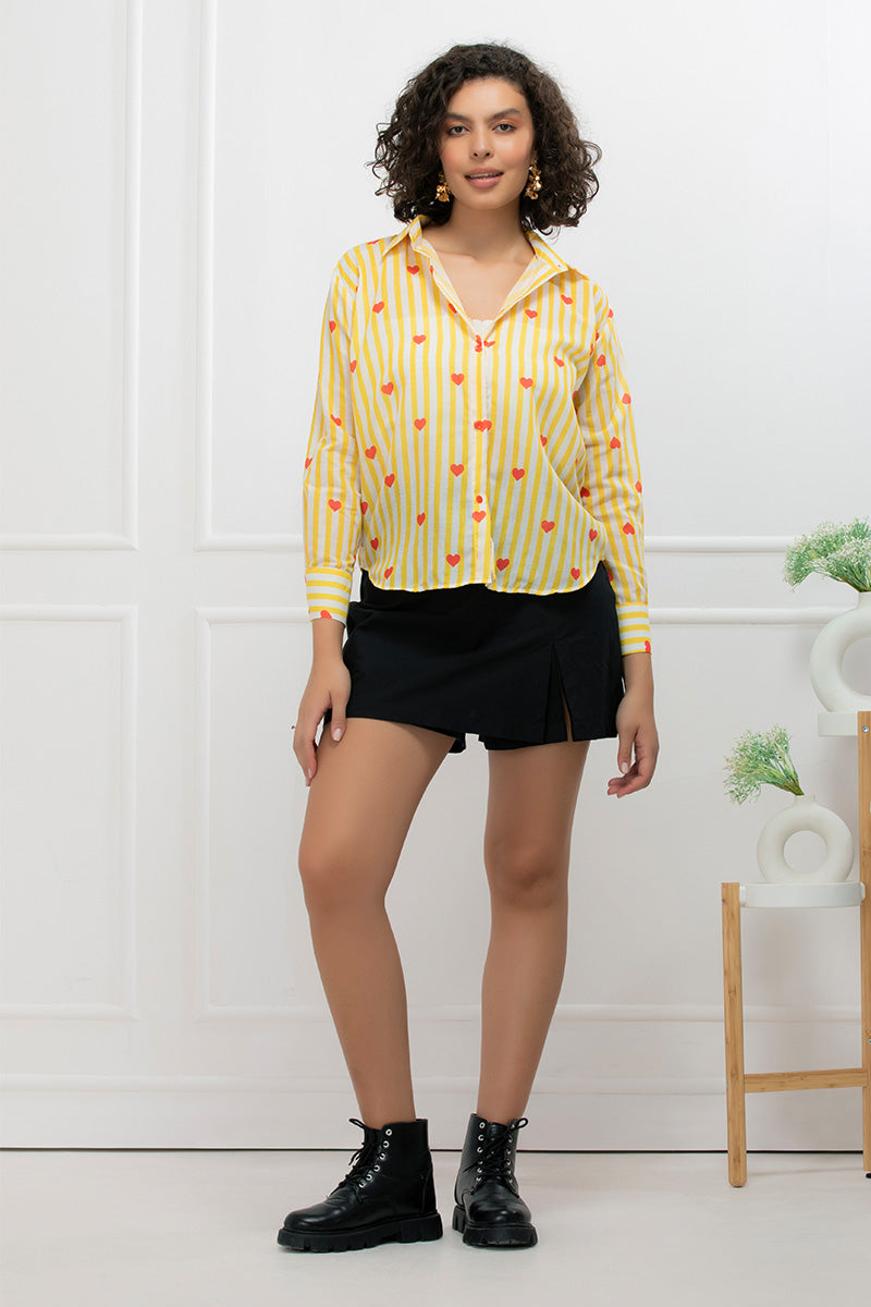 Playful yet polished, this button-down shirt features cheerful lemon yellow stripes adorned with adorable red heart prints. Made for the bold romantic, this shirt blends classic tailoring with a fun twist. The relaxed fit makes it easy to dress up or down — a versatile piece that instantly adds personality to your look.