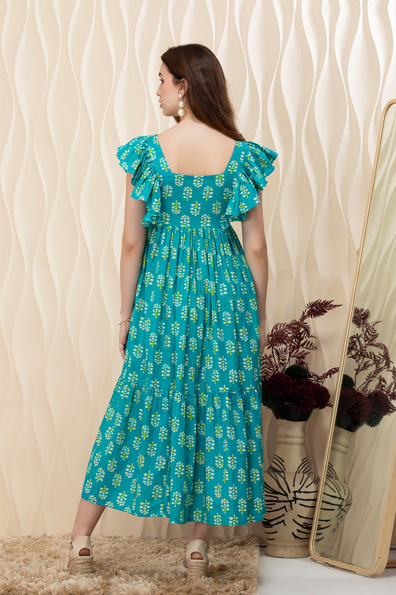 Step into effortless elegance with our Turquoise Whisper Ruffle Dress. Designed in a breezy turquoise hue with delicate floral motifs, this dress is a perfect blend of comfort and charm. The square neckline with layered ruffle sleeves adds a touch of femininity, while the relaxed tiered silhouette ensures all-day comfort. Pair it with wedges or flats for a casual day out, or dress it up with statement jewelry for an evening look. A versatile must-have for every wardrobe!