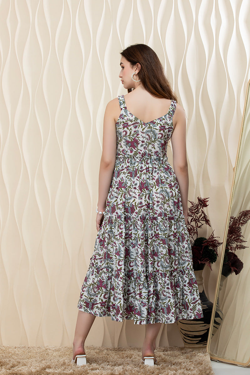 Step into effortless elegance with our Ethereal Bloom Sleeveless Tiered Maxi Dress. Adorned with intricate floral prints in deep plum, sage green, and muted ivory, this dress exudes timeless charm with a touch of bohemian flair. The sleeveless silhouette, scoop neckline with soft ruffle detail, and tiered design create a flowy, feminine fit perfect for all-day comfort.