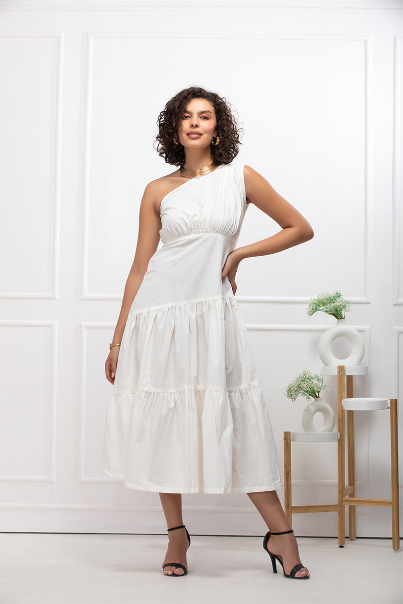 Whether styled with minimal gold jewellery or statement heels, this white one-shoulder midi dress is a timeless piece that brings grace and sophistication to any occasion.